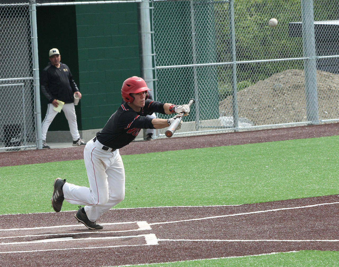 Matt Hilborn’s bunt moves up a runner against Meridian. (Photo by Jim Waller/Whidbey News-Times)