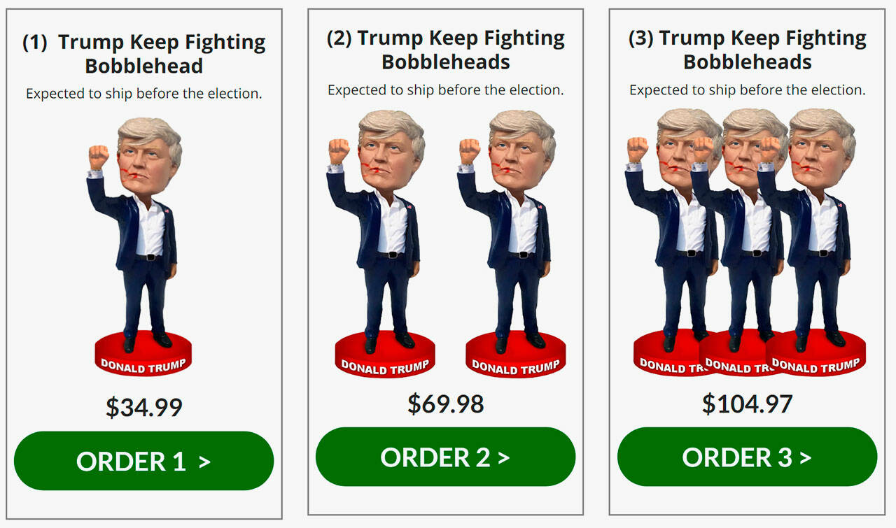 - Three Trump “Keep Fighting” Bobbleheads: Expected to ship before the election, priced at $104.97.